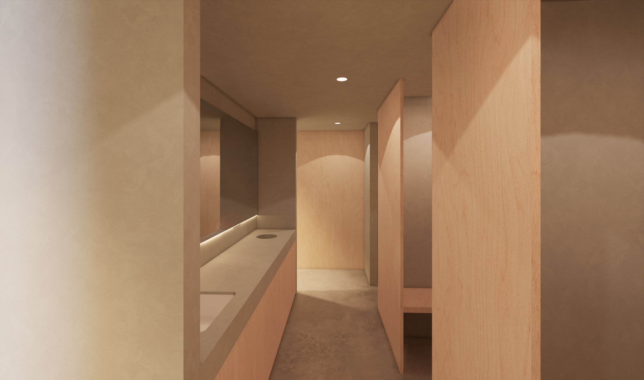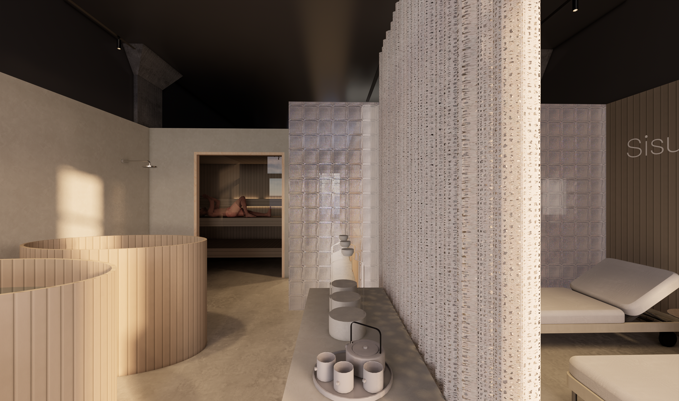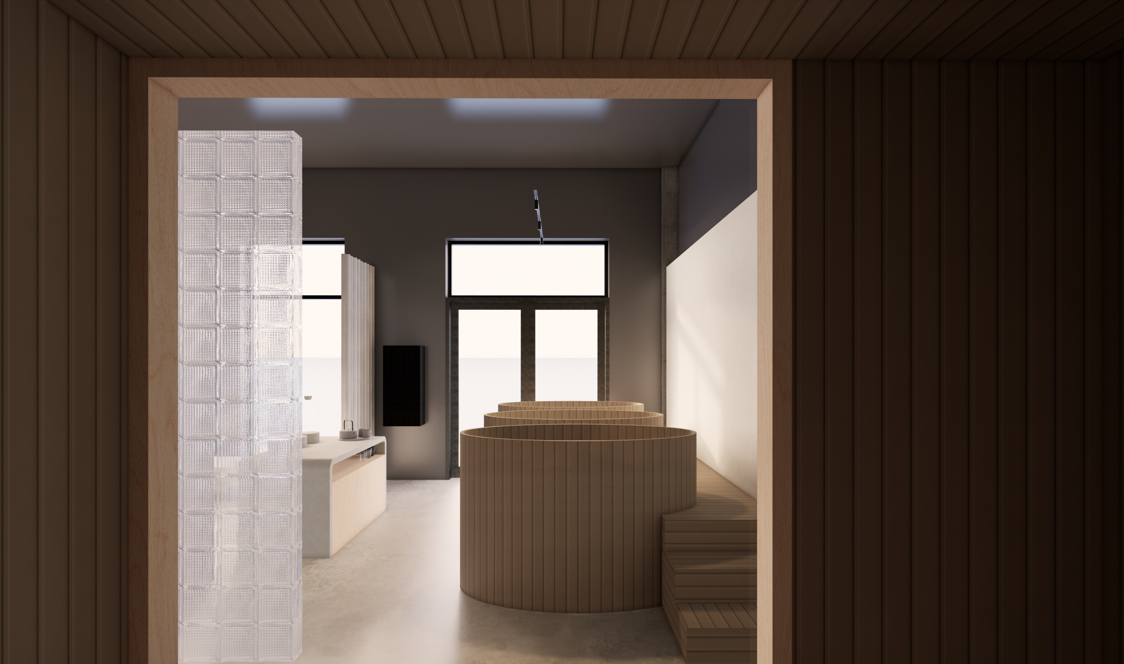 The interior is organized as a deliberate journey, moving from reception and change rooms into a sequence of communal and private sauna spaces, cold plunge zones, and areas for rest and recovery. Spatial transitions are slow and intentional, using shifts in ceiling height, lighting, and enclosure to guide the body into a calmer rhythm. Circulation is clear yet understated, allowing guests to move intuitively through the space without interruption.